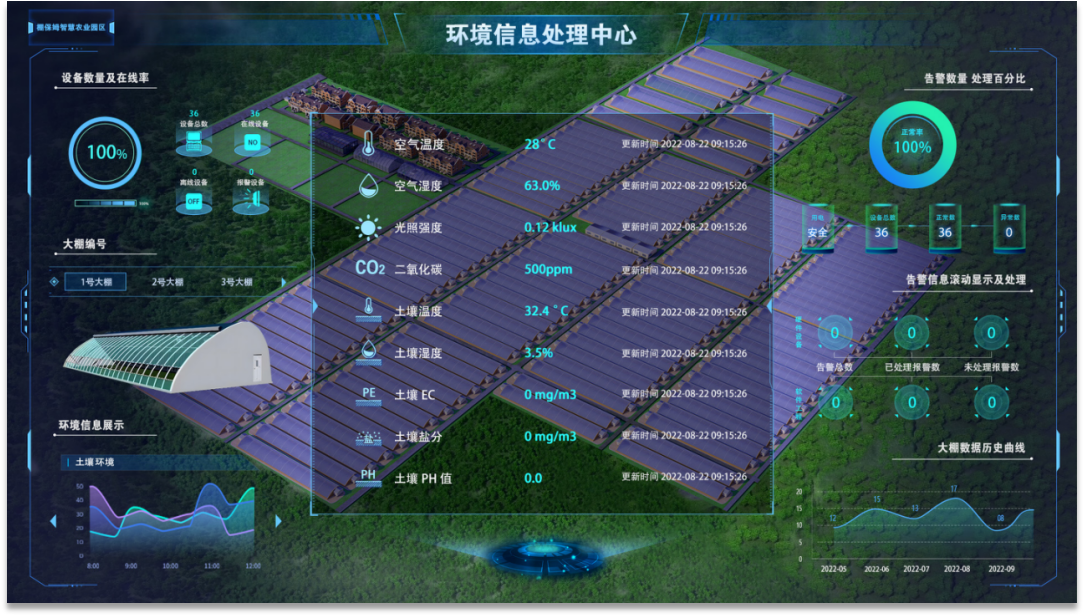 通過天地圖、虛擬園區、智能大棚等園區管理控制板塊,可以直觀立體的展示園區分布、大棚數量、種植面積以及物聯網設備在線等情況,并可以具體查看某個大棚的編號、建棚日期等基本信息以及棚內農作物的實時生長情況。
